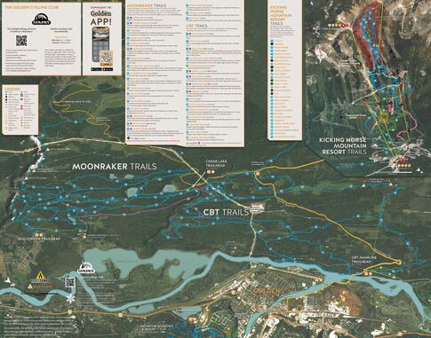 The Golden Bike Trail Map is your guide to over 129 km of cross-country trails in the Moonraker, CBT, and Mountain Shadows trail systems, as well as the Mount 7 downhill trails and Kicking Horse Bike Park.